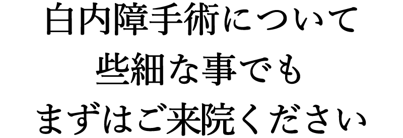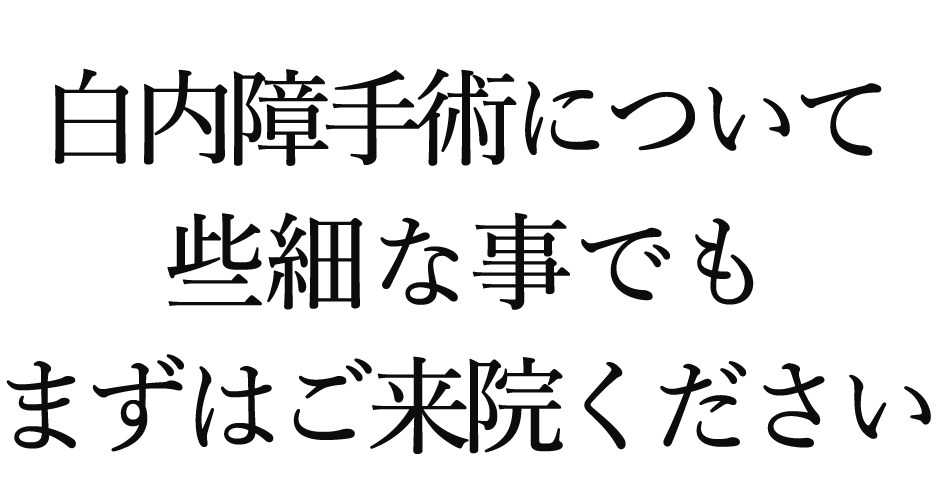 白内障手術を検討する際に、不安のある方が多くいらっしゃいます。当院では、痛みや後遺症など、リスクの少ない手術法である事を十分にご理解いただくための説明をさせていただいております。その他、ご不明な点、相談したい事などがありましたら、些細な事でも構いませんので、電話またはメール相談よりお問い合わせください。